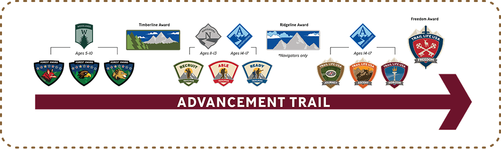 In Trail Life USA, skills universally needed for godly manhood are developed through required Trail Badges as young men earn the ranks of Able Trailman, Ready Trailman, Journey, Ascent, Horizon, and Freedom. Elective Trail Badges help a Trailman explore unique areas of gifting and come to understand the way God has specially created him.